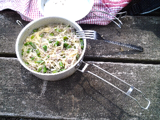 Intercetto mio Padre all'altezza di una radura e si fa pausa pranzo: un bel piatto di spaghettini con salsiccia di Farnese speziata forte e Asparago dop e via ci lusso. Un pochino di schiaccia con le olive e un tocco di pecorino di Manciano giovane chiudono l'argomento!